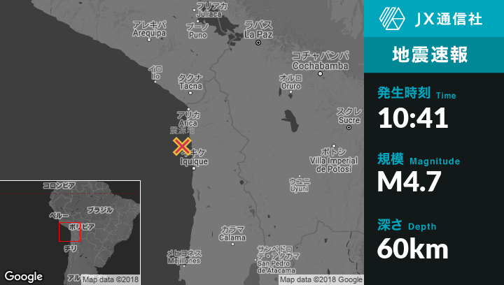6月22日 10:41頃、チリのIquiqueから北北西91kmの地点でM4.7の地震がありました。