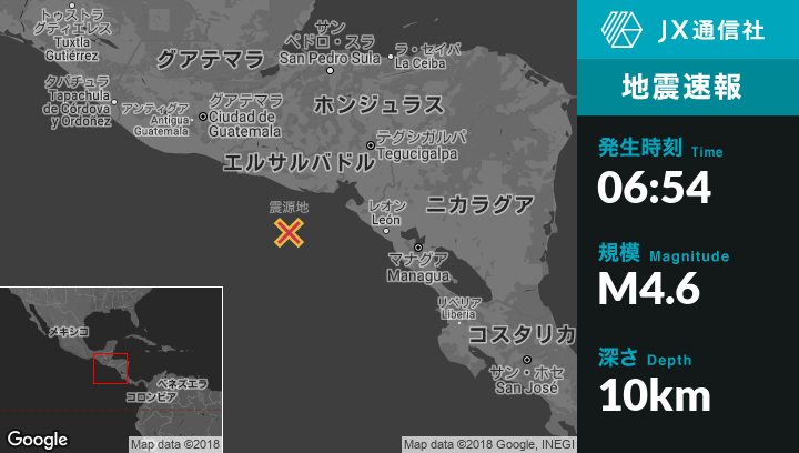 6月24日 06:54頃、エルサルバドルのPuerto El Triunfoから南南西90kmの地点でM4.6の地震がありました。