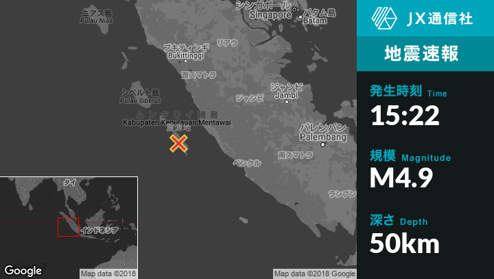| 震源地 | インドネシアのSungaipenuhから西南西158kmの地点 |