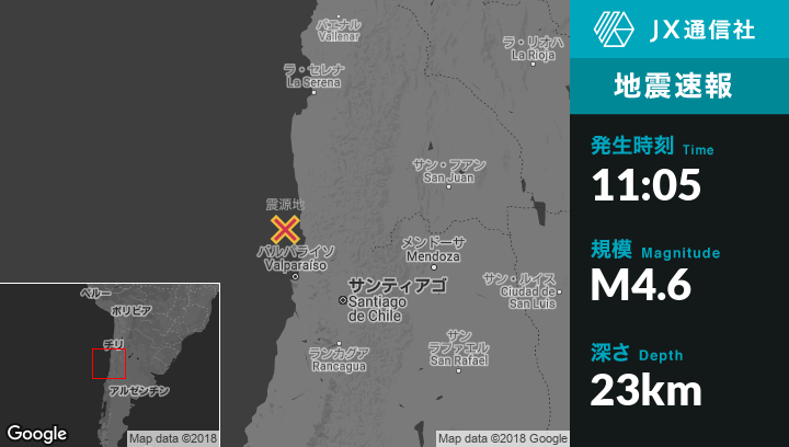 6月26日 11:05頃、チリのLa Liguaから西北西64kmの地点でM4.6の地震がありました。