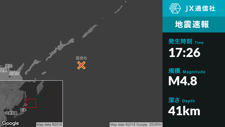 8月08日 17:26頃、ロシアのKuril'skから南東157kmの地点でM4.8の地震がありました。