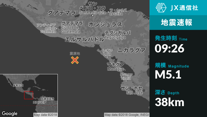 8月09日 09:26頃、エルサルバドルのLa Libertadから南128kmの地点でM5.1の地震がありました。