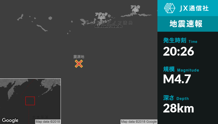 | 震源地 | アラスカのAmatignak Islandから南南東157kmの地点 |