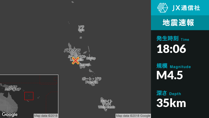 8月11日 18:06頃、バヌアツのLuganvilleから南36kmの地点でM4.5の地震がありました。