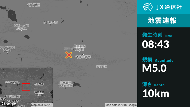 8月18日 08:43頃、中国のShiheziから南東55kmの地点でM5.0の地震がありました。