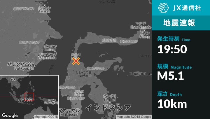 9月28日 19:50頃、インドネシアのPaluから北北東17kmの地点でM5.1の地震がありました。