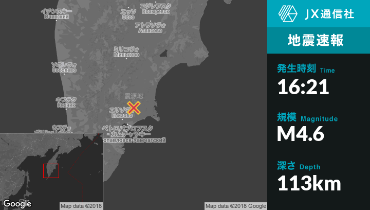 | 震源地 | ロシアのYelizovoから北東52kmの地点 |
