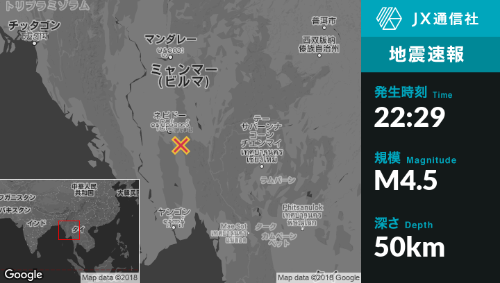| 震源地 | ミャンマーのPyinmanaから南南東36kmの地点 |