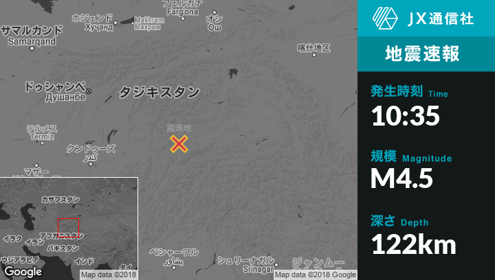 10月07日 10:35頃、タジキスタンのRoshtqal'aから西北西16kmの地点でM4.5の地震がありました。