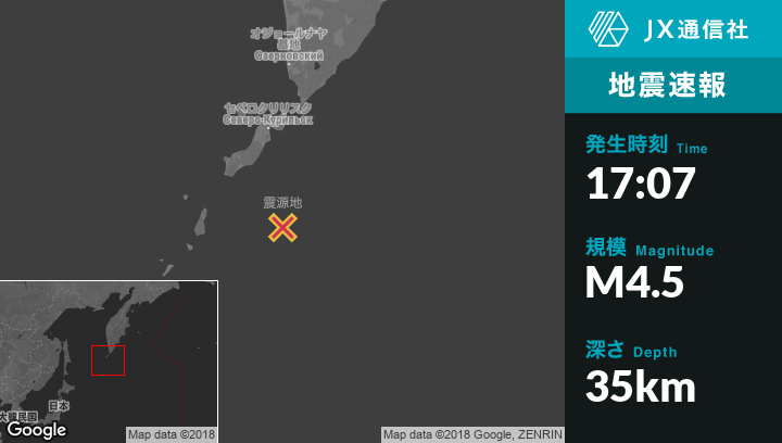 10月09日 17:07頃、ロシアのSevero-Kuril'skから南137kmの地点でM4.5の地震がありました。
