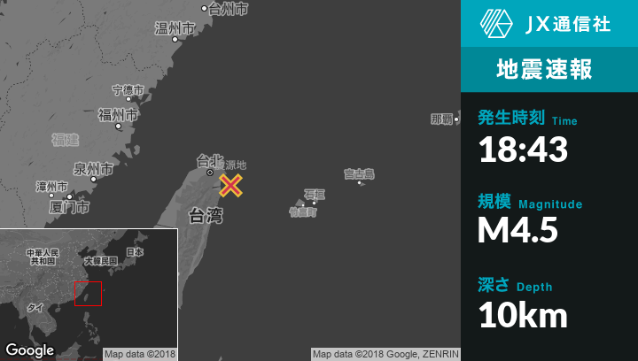 10月10日 18:43頃、台湾のYilanから東北東33kmの地点でM4.5の地震がありました。
