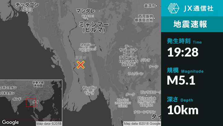 10月10日 19:28頃、ミャンマーのPromeから東北東44kmの地点でM5.1の地震がありました。