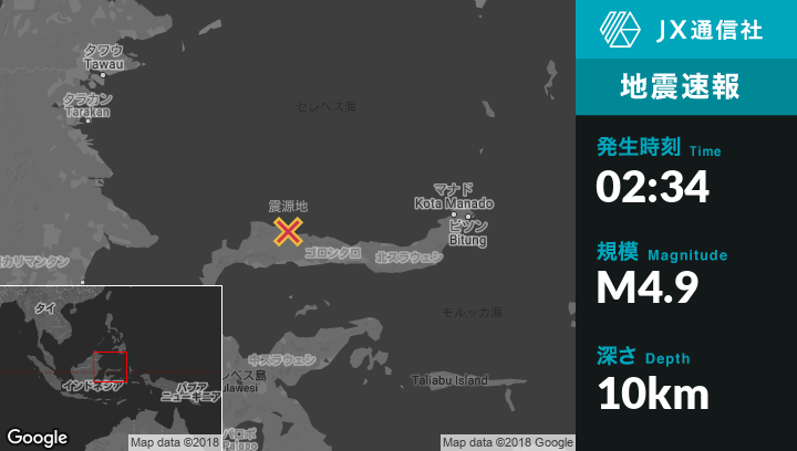 10月11日 02:34頃、インドネシアのKaliから北東17kmの地点でM4.9の地震がありました。