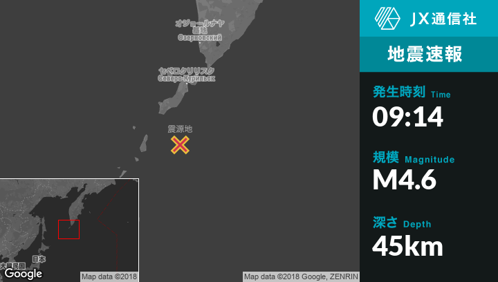 10月11日 09:14頃、ロシアのSevero-Kuril'skから南132kmの地点でM4.6の地震がありました。