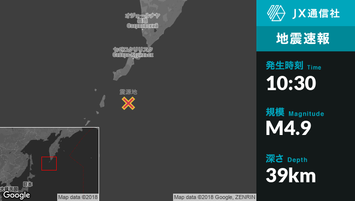 10月11日 10:30頃、ロシアのSevero-Kuril'skから南136kmの地点でM4.9の地震がありました。