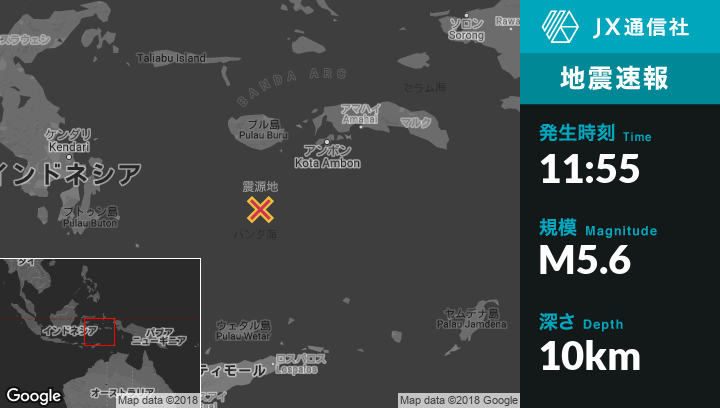 10月11日 11:55頃、インドネシアのLeksulaから南139kmの地点でM5.6の地震がありました。