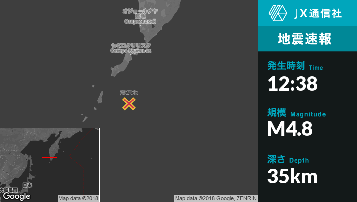 10月11日 12:38頃、ロシアのSevero-Kuril'skから南149kmの地点でM4.8の地震がありました。