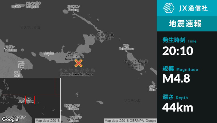 | 震源地 | パプアニューギニアのKimbeから東南東133kmの地点 |