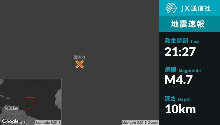 10月11日 21:27頃、フランス領ギアナのRemire-Montjolyから北東1351kmの地点でM4.7の地震がありました。