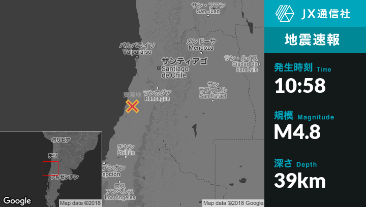 10月12日 10:58頃、チリのSanta Cruzから西南西44kmの地点でM4.8の地震がありました。