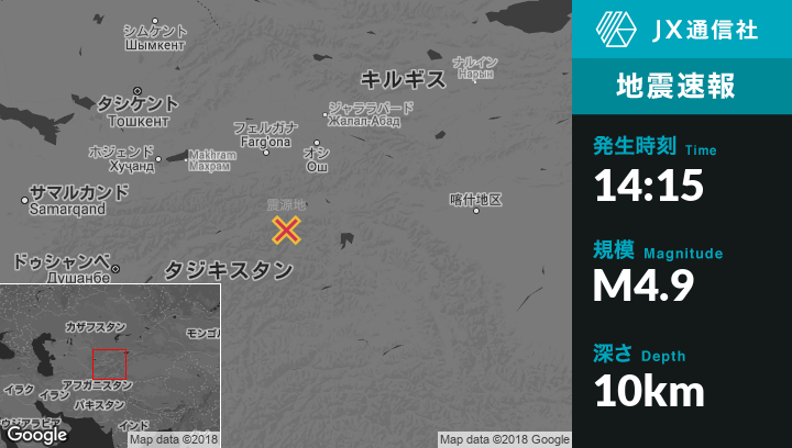 10月14日 14:15頃、タジキスタンのKarakenjaから東58kmの地点でM4.9の地震がありました。