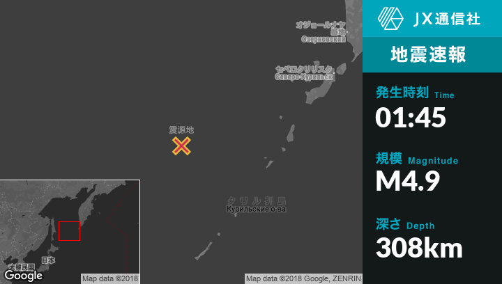 10月16日 01:45頃、ロシアのVostokから東北東179kmの地点でM4.9の地震がありました。