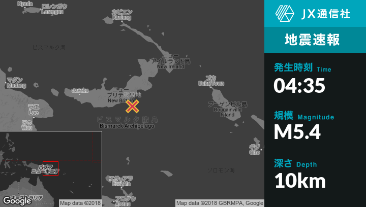 10月16日 04:35頃、パプアニューギニアのKimbeから東南東138kmの地点でM5.4の地震がありました。