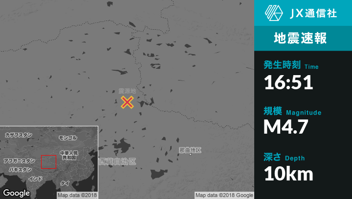 10月18日 16:51頃、中国のPubuから北北西208kmの地点でM4.7の地震がありました。