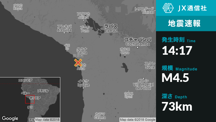 10月19日 14:17頃、チリのAricaから西北西25kmの地点でM4.5の地震がありました。