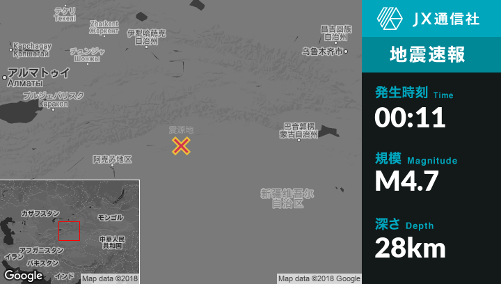 10月22日 00:11頃、中国のKuqaから西43kmの地点でM4.7の地震がありました。