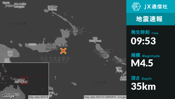 10月22日 09:53頃、パプアニューギニアのKimbeから東南東189kmの地点でM4.5の地震がありました。