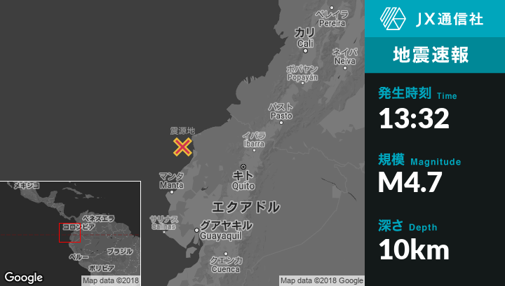 10月22日 13:32頃、エクアドルのMuisneから西37kmの地点でM4.7の地震がありました。