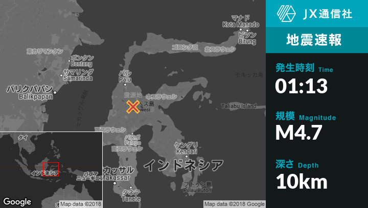 10月23日 01:13頃、インドネシアのKasiguncuから南西61kmの地点でM4.7の地震がありました。