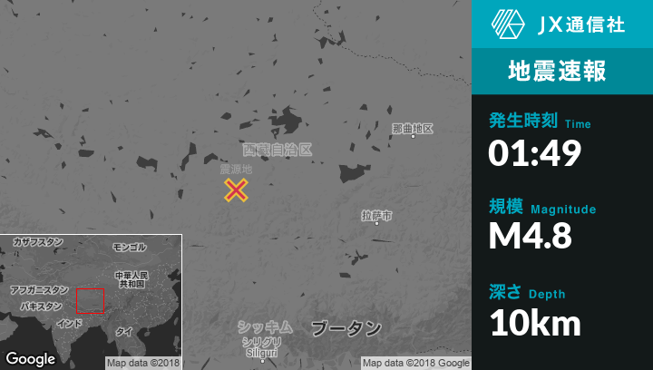 10月23日 01:49頃、中国のJiajuedibuから西南西98kmの地点でM4.8の地震がありました。