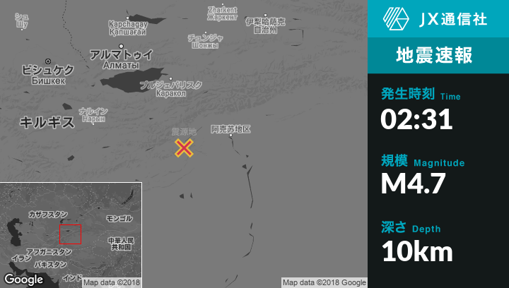 10月24日 02:31頃、中国のAksuから西125kmの地点でM4.7の地震がありました。