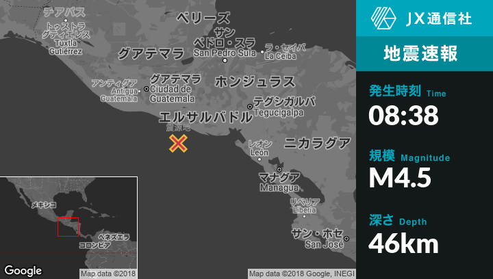 10月24日 08:38頃、エルサルバドルのLa Libertadから南南西52kmの地点でM4.5の地震がありました。