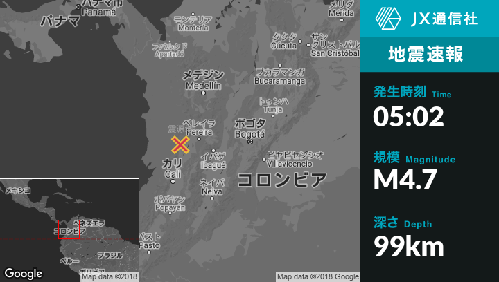 10月25日 05:02頃、コロンビアのEl Cairoから西南西8kmの地点でM4.7の地震がありました。