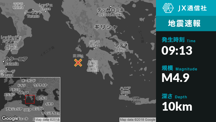 10月26日 09:13頃、ギリシャのLithakiaから南西32kmの地点でM4.9の地震がありました。