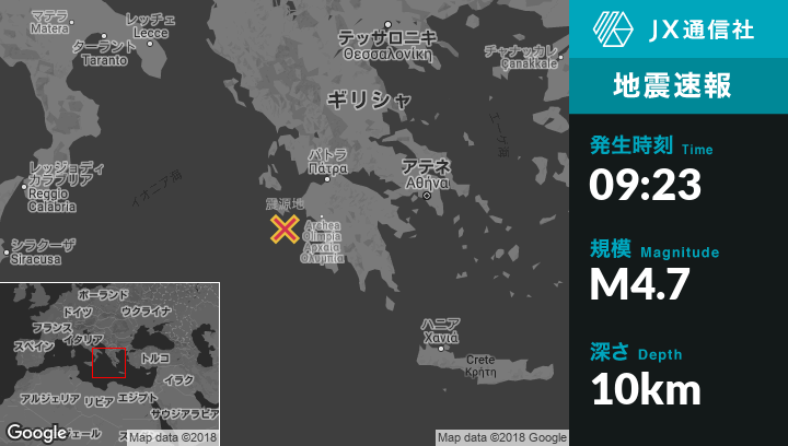 10月26日 09:23頃、ギリシャのLithakiaから南19kmの地点でM4.7の地震がありました。