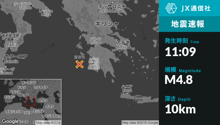10月26日 11:09頃、ギリシャのLithakiaから南南西50kmの地点でM4.8の地震がありました。