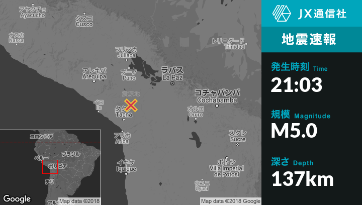 10月26日 21:03頃、ペルーのChuquitiraから東11kmの地点でM5.0の地震がありました。
