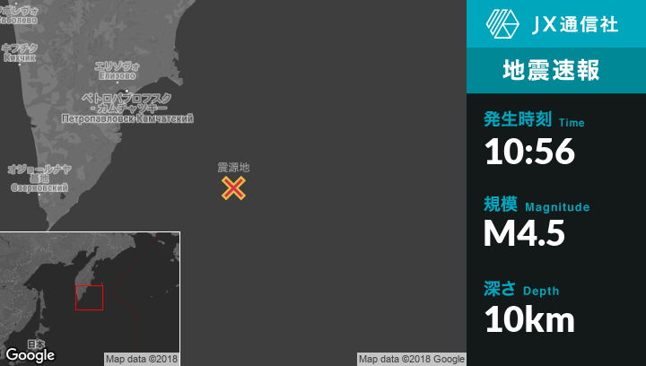 10月27日 10:56頃、ロシアのPetropavlovsk-Kamchatskiyから南東235kmの地点でM4.5の地震がありました。