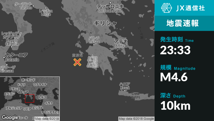 10月27日 23:33頃、ギリシャのLithakiaから南西53kmの地点でM4.6の地震がありました。