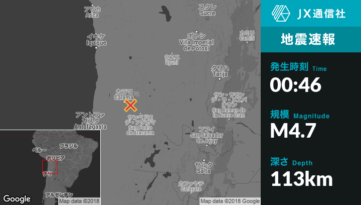 10月28日 00:46頃、チリのCalamaから東28kmの地点でM4.7の地震がありました。