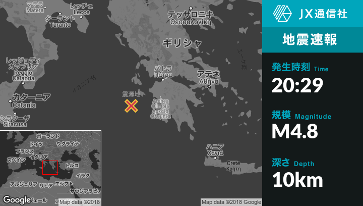 10月29日 20:29頃、ギリシャのMouzakiから南西53kmの地点でM4.8の地震がありました。