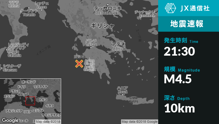 10月29日 21:30頃、ギリシャのLithakiaから南33kmの地点でM4.5の地震がありました。