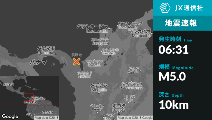 10月30日 06:31頃、コロンビアのAcandiから北北東20kmの地点でM5.0の地震がありました。