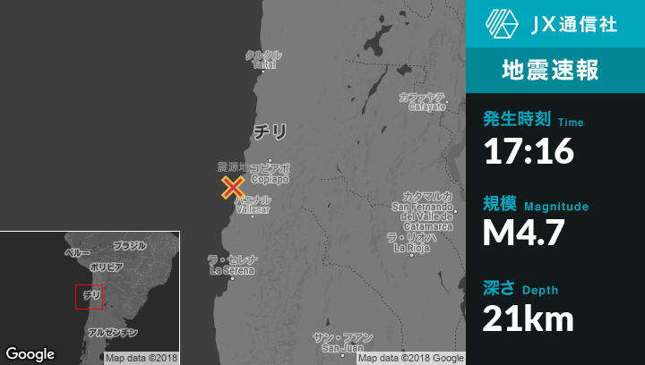 11月08日 17:16頃、チリのVallenarから北北西94kmの地点でM4.7の地震がありました。