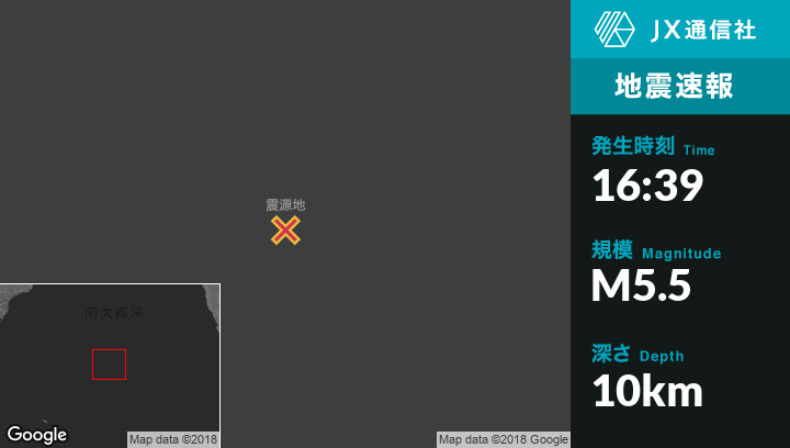 11月09日 16:39頃、セントヘレナのEdinburgh of the Seven Seasから南南西695kmの地点でM5.5の地震がありました。