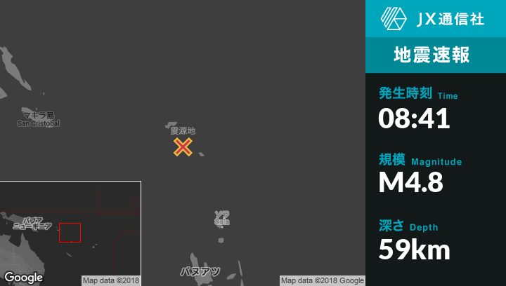 11月10日 08:41頃、ソロモン諸島のLataから南東84kmの地点でM4.8の地震がありました。